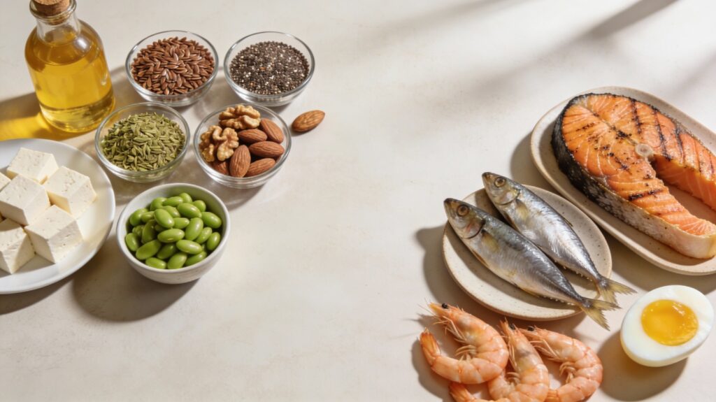 Foods high in omega-3 include fatty fish like salmon, sardines, mackerel, and anchovies. Plant-based sources such as flaxseeds, chia seeds, walnuts, and soybeans also provide omega-3s, though the body converts them less efficiently than fish sources.