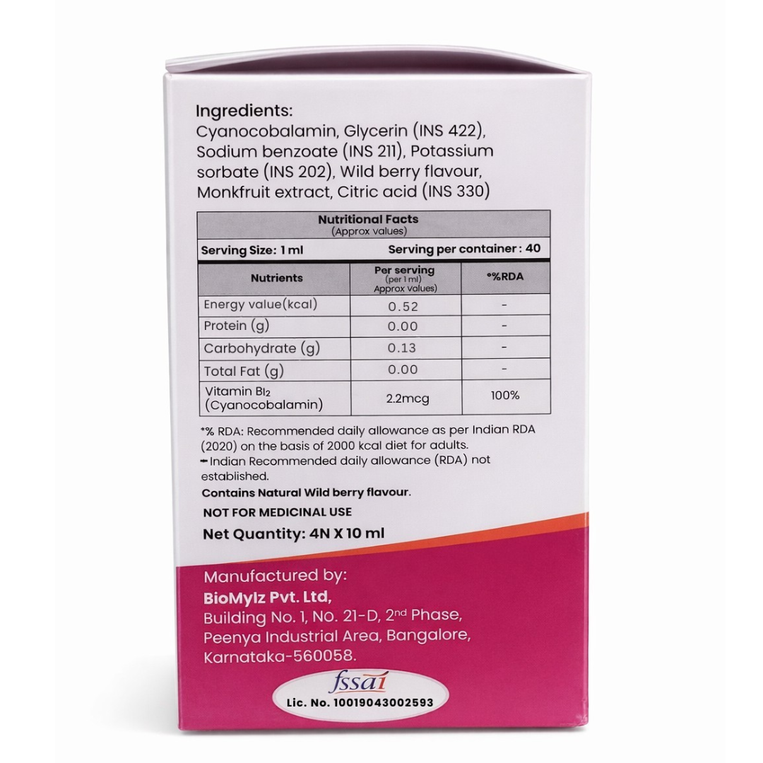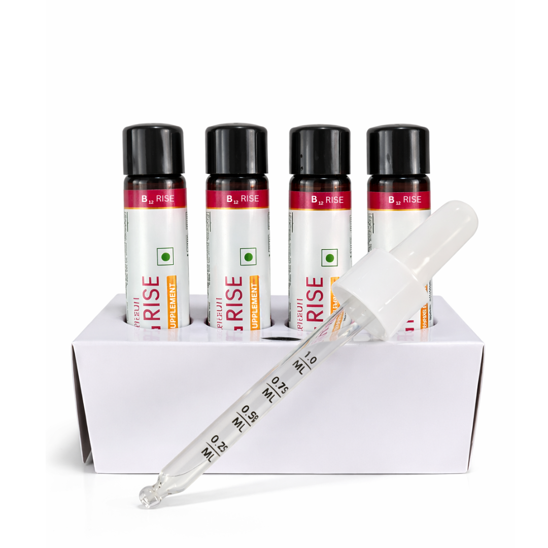 Each pack contains four 10ml vials, providing a total of 40 servings to keep your nutritional goals on track. Our oral liquid delivery system is engineered for quick mucosal absorption into the bloodstream, making it an ideal choice for those seeking fast-acting results. Whether you are looking to combat fatigue or supplement a plant-based diet, B₁₂ RISE delivers 100% of the Indian Recommended Daily Allowance (RDA) in every single 1ml serving.